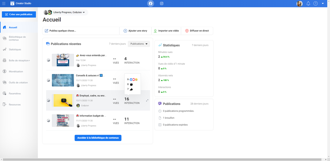Aujourd’hui, nous allons vous présenter le Creator Studio Facebook qui est un outil de programmation de contenus. Vous pouvez également publier directement ou mettre vos contenus en brouillon.
